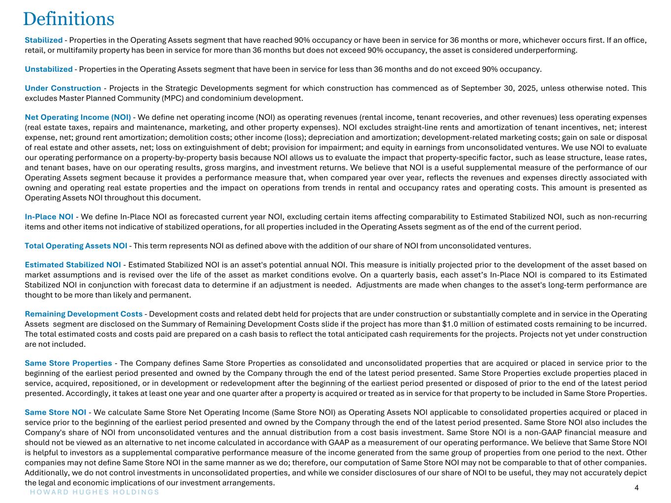 4H O W A R D H U G H E S H O L D I N G S 4 Stabilized - Properties in the Operating Assets segment that have reached 90% occupancy or have been in service for 36 months or more, whichever occurs first. If an office, retail, or multifamily property has been in service for more than 36 months but does not exceed 90% occupancy, the asset is considered underperforming. Unstabilized - Properties in the Operating Assets segment that have been in service for less than 36 months and do not exceed 90% occupancy. Under Construction - Projects in the Strategic Developments segment for which construction has commenced as of September 30, 2025, unless otherwise noted. This excludes Master Planned Community (MPC) and condominium development. Net Operating Income (NOI) - We define net operating income (NOI) as operating revenues (rental income, tenant recoveries, and other revenues) less operating expenses (real estate taxes, repairs and maintenance, marketing, and other property expenses). NOI excludes straight-line rents and amortization of tenant incentives, net; interest expense, net; ground rent amortization; demolition costs; other income (loss); depreciation and amortization; development-related marketing costs; gain on sale or disposal of real estate and other assets, net; loss on extinguishment of debt; provision for impairment; and equity in earnings from unconsolidated ventures. We use NOI to evaluate our operating performance on a property-by-property basis because NOI allows us to evaluate the impact that property-specific factor, such as lease structure, lease rates, and tenant bases, have on our operating results, gross margins, and investment returns. We believe that NOI is a useful supplemental measure of the performance of our Operating Assets segment because it provides a performance measure that, when compared year over year, reflects the revenues and expenses directly associated with owning and operating real estate properties and the impact on operations from trends in rental and occupancy rates and operating costs. This amount is presented as Operating Assets NOI throughout this document. In-Place NOI - We define In-Place NOI as forecasted current year NOI, excluding certain items affecting comparability to Estimated Stabilized NOI, such as non-recurring items and other items not indicative of stabilized operations, for all properties included in the Operating Assets segment as of the end of the current period. Total Operating Assets NOI - This term represents NOI as defined above with the addition of our share of NOI from unconsolidated ventures. Estimated Stabilized NOI - Estimated Stabilized NOI is an asset's potential annual NOI. This measure is initially projected prior to the development of the asset based on market assumptions and is revised over the life of the asset as market conditions evolve. On a quarterly basis, each asset’s In-Place NOI is compared to its Estimated Stabilized NOI in conjunction with forecast data to determine if an adjustment is needed. Adjustments are made when changes to the asset's long-term performance are thought to be more than likely and permanent. Remaining Development Costs - Development costs and related debt held for projects that are under construction or substantially complete and in service in the Operating Assets segment are disclosed on the Summary of Remaining Development Costs slide if the project has more than $1.0 million of estimated costs remaining to be incurred. The total estimated costs and costs paid are prepared on a cash basis to reflect the total anticipated cash requirements for the projects. Projects not yet under construction are not included. Same Store Properties - The Company defines Same Store Properties as consolidated and unconsolidated properties that are acquired or placed in service prior to the beginning of the earliest period presented and owned by the Company through the end of the latest period presented. Same Store Properties exclude properties placed in service, acquired, repositioned, or in development or redevelopment after the beginning of the earliest period presented or disposed of prior to the end of the latest period presented. Accordingly, it takes at least one year and one quarter after a property is acquired or treated as in service for that property to be included in Same Store Properties. Same Store NOI - We calculate Same Store Net Operating Income (Same Store NOI) as Operating Assets NOI applicable to consolidated properties acquired or placed in service prior to the beginning of the earliest period presented and owned by the Company through the end of the latest period presented. Same Store NOI also includes the Company's share of NOI from unconsolidated ventures and the annual distribution from a cost basis investment. Same Store NOI is a non-GAAP financial measure and should not be viewed as an alternative to net income calculated in accordance with GAAP as a measurement of our operating performance. We believe that Same Store NOI is helpful to investors as a supplemental comparative performance measure of the income generated from the same group of properties from one period to the next. Other companies may not define Same Store NOI in the same manner as we do; therefore, our computation of Same Store NOI may not be comparable to that of other companies. Additionally, we do not control investments in unconsolidated properties, and while we consider disclosures of our share of NOI to be useful, they may not accurately depict the legal and economic implications of our investment arrangements. Definitions
