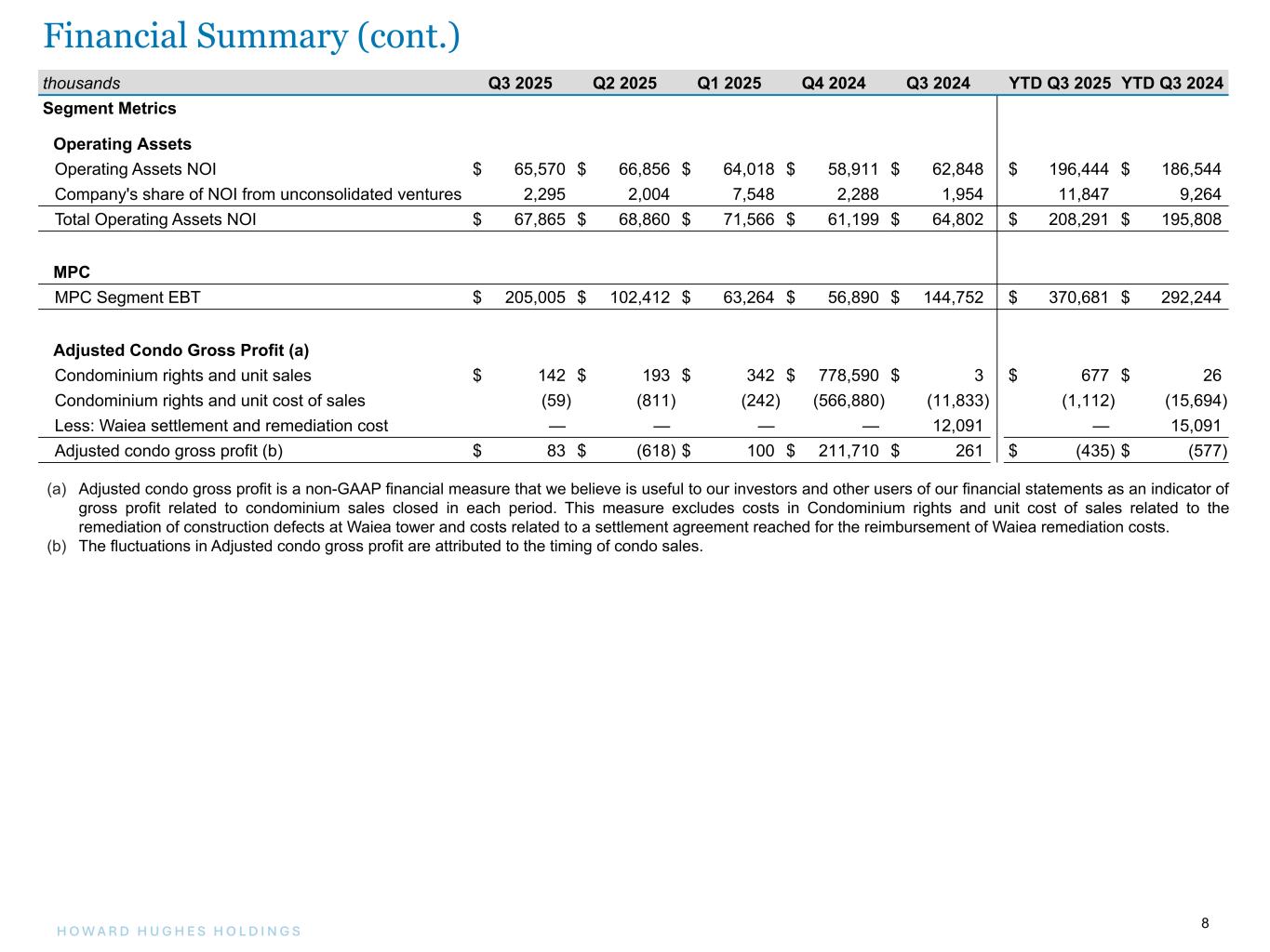 7H O W A R D H U G H E S H O L D I N G S 7 thousands except percentages Q3 2025 Q2 2025 Q1 2025 Q4 2024 Q3 2024 YTD Q3 2025 YTD Q3 2024 Debt Summary Total debt payable (a) $ 5,324,080 $ 5,260,184 $ 5,286,877 $ 5,168,437 $ 5,338,119 $ 5,324,080 $ 5,338,119 Fixed-rate debt $ 3,848,684 $ 3,867,214 $ 3,780,580 $ 3,769,529 $ 3,680,904 $ 3,848,684 $ 3,680,904 Weighted avg. rate - fixed 4.77 % 4.78 % 4.72 % 4.71 % 4.68 % 4.77 % 4.68 % Variable-rate debt, excluding condominium financing $ 802,988 $ 806,291 $ 1,068,223 $ 1,067,682 $ 1,078,503 $ 802,988 $ 1,078,503 Weighted avg. rate - variable (b) 7.22 % 7.15 % 6.99 % 6.98 % 7.95 % 7.22 % 7.95 % Condominium debt outstanding at end of period $ 672,408 $ 586,679 $ 438,074 $ 331,226 $ 578,712 $ 672,408 $ 578,712 Weighted avg. rate - condominium financing 8.04 % 8.11 % 8.10 % 8.13 % 9.36 % 8.04 % 9.36 % Leverage ratio (debt to enterprise value) 60.24 % 66.49 % 61.35 % 60.67 % 59.90 % 60.24 % 59.90 % General and Administrative Expenses General and administrative (G&A) (c)(d) $ 28,281 $ 34,552 $ 22,436 $ 22,822 $ 24,862 $ 85,269 $ 68,930 Less: Non-cash stock compensation (2,585) (6,167) (2,751) (2,229) (2,911) (11,503) (6,875) Cash G&A (e) $ 25,696 $ 28,385 $ 19,685 $ 20,593 $ 21,951 $ 73,766 $ 62,055 (a) Represents total mortgages, notes, and loans payable, as stated in our GAAP financial statements as of the respective date, excluding unamortized deferred financing costs. (b) Includes the impact of interest rate derivatives. (c) G&A expense for the second quarter of 2025 includes $9.7 million of severance costs and $3.4 million of non-cash stock compensation related to a strategic reduction in force. (d) G&A expense for the third quarter of 2025 includes the first full quarter of the Pershing Square advisory fees comprised of a $3.8 million base fee and a $3.4 million variable fee. (e) Cash G&A is a non-GAAP financial measure that we believe is useful to our investors and other users of our financial statements as an indicator of overhead efficiency without regard to non-cash expenses associated with stock compensation. However, it should not be used as an alternative to general and administrative expenses in accordance with GAAP. Financial Summary