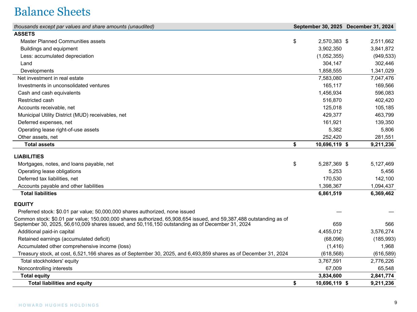 9H O W A R D H U G H E S H O L D I N G S 9 thousands except par values and share amounts (unaudited) September 30, 2025 December 31, 2024 ASSETS Master Planned Communities assets $ 2,570,383 $ 2,511,662 Buildings and equipment 3,902,350 3,841,872 Less: accumulated depreciation (1,052,355) (949,533) Land 304,147 302,446 Developments 1,858,555 1,341,029 Net investment in real estate 7,583,080 7,047,476 Investments in unconsolidated ventures 165,117 169,566 Cash and cash equivalents 1,456,934 596,083 Restricted cash 516,870 402,420 Accounts receivable, net 125,018 105,185 Municipal Utility District (MUD) receivables, net 429,377 463,799 Deferred expenses, net 161,921 139,350 Operating lease right-of-use assets 5,382 5,806 Other assets, net 252,420 281,551 Total assets $ 10,696,119 $ 9,211,236 LIABILITIES Mortgages, notes, and loans payable, net $ 5,287,369 $ 5,127,469 Operating lease obligations 5,253 5,456 Deferred tax liabilities, net 170,530 142,100 Accounts payable and other liabilities 1,398,367 1,094,437 Total liabilities 6,861,519 6,369,462 EQUITY Preferred stock: $0.01 par value; 50,000,000 shares authorized, none issued — — Common stock: $0.01 par value; 150,000,000 shares authorized, 65,908,654 issued, and 59,387,488 outstanding as of September 30, 2025, 56,610,009 shares issued, and 50,116,150 outstanding as of December 31, 2024 659 566 Additional paid-in capital 4,455,012 3,576,274 Retained earnings (accumulated deficit) (68,096) (185,993) Accumulated other comprehensive income (loss) (1,416) 1,968 Treasury stock, at cost, 6,521,166 shares as of September 30, 2025, and 6,493,859 shares as of December 31, 2024 (618,568) (616,589) Total stockholders' equity 3,767,591 2,776,226 Noncontrolling interests 67,009 65,548 Total equity 3,834,600 2,841,774 Total liabilities and equity $ 10,696,119 $ 9,211,236 Balance Sheets