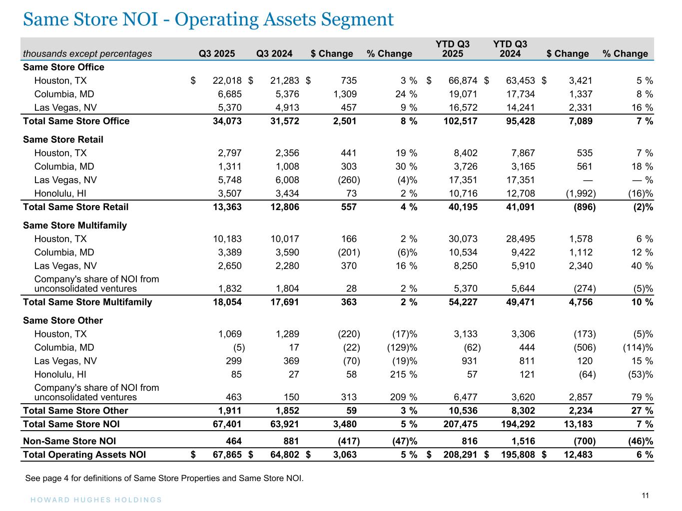 10H O W A R D H U G H E S H O L D I N G S 10 thousands except per share amounts (unaudited) Q3 2025 Q3 2024 YTD Q3 2025 YTD Q3 2024 REVENUES Condominium rights and unit sales $ 142 $ 3 $ 677 $ 26 Master Planned Communities land sales 248,467 198,239 445,150 385,444 Rental revenue 111,377 108,613 330,882 315,461 Other land, rental, and property revenues 14,237 10,700 34,297 31,105 Builder price participation 16,012 9,592 39,437 35,063 Total revenues 390,235 327,147 850,443 767,099 EXPENSES Condominium rights and unit cost of sales 59 11,833 1,112 15,694 Master Planned Communities cost of sales 78,280 72,582 148,672 143,254 Operating costs 45,940 50,841 147,247 149,412 Rental property real estate taxes 15,630 14,484 46,294 43,799 Provision for (recovery of) doubtful accounts (345) 190 41 327 General and administrative 28,281 24,862 85,269 68,930 Depreciation and amortization 46,381 44,088 135,845 134,833 Other 3,332 3,582 12,402 11,268 Total expenses 217,558 222,462 576,882 567,517 OTHER Gain (loss) on sale or disposal of real estate and other assets, net 14,449 3,165 29,834 7,959 Other income (loss), net 2,445 90,489 1,963 91,870 Total other 16,894 93,654 31,797 99,829 Operating income (loss) 189,571 198,339 305,358 299,411 Interest income 15,287 5,341 31,736 19,270 Interest expense (43,856) (43,802) (128,644) (122,597) Gain (loss) on extinguishment of debt (173) — (480) (198) Gain (loss) on sale of MUD receivables — (51,525) (48,197) (51,525) Equity in earnings (losses) from unconsolidated ventures (2,529) (1,630) (3,096) (4,230) Income (loss) from continuing operations before income taxes 158,300 106,723 156,677 140,131 Income tax expense (benefit) 38,898 10,195 38,513 17,236 Net income (loss) from continuing operations 119,402 96,528 118,164 122,895 Net income (loss) from discontinued operations, net of taxes — (24,031) — (81,807) Net income (loss) 119,402 72,497 118,164 41,088 Net (income) loss attributable to noncontrolling interests 106 273 (267) 297 Net income (loss) attributable to common stockholders $ 119,508 $ 72,770 $ 117,897 $ 41,385 Basic income (loss) per share — continuing operations $ 2.03 $ 1.95 $ 2.16 $ 2.48 Diluted income (loss) per share — continuing operations $ 2.02 $ 1.95 $ 2.15 $ 2.48 Statements of Operations